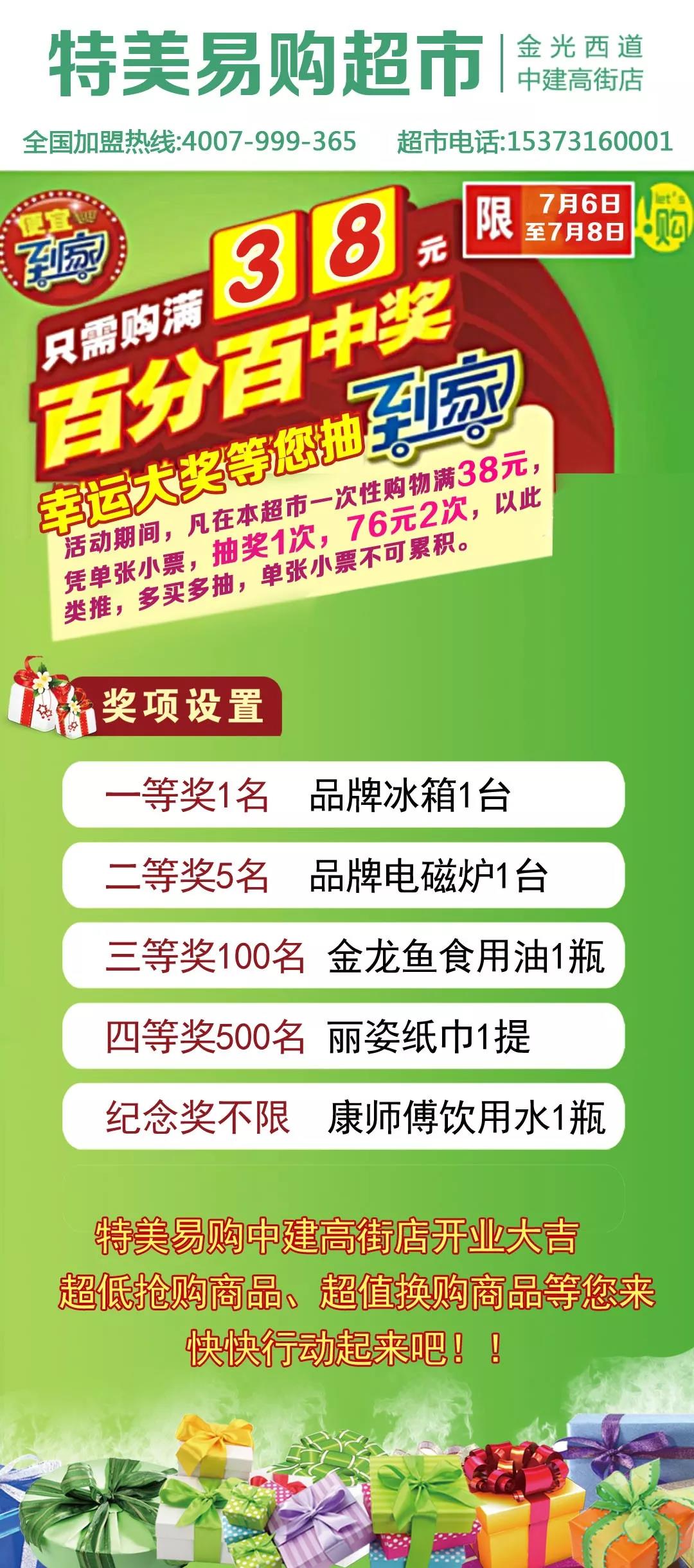 在开业期间7月6日-8日三天时间,凡是在超市区1次性购物满38元的顾客,可凭当日电脑小票可参加抽奖1次,78元2次,118元3次,以此类推,多买多抽,不设上限,单张小票不可累积;
