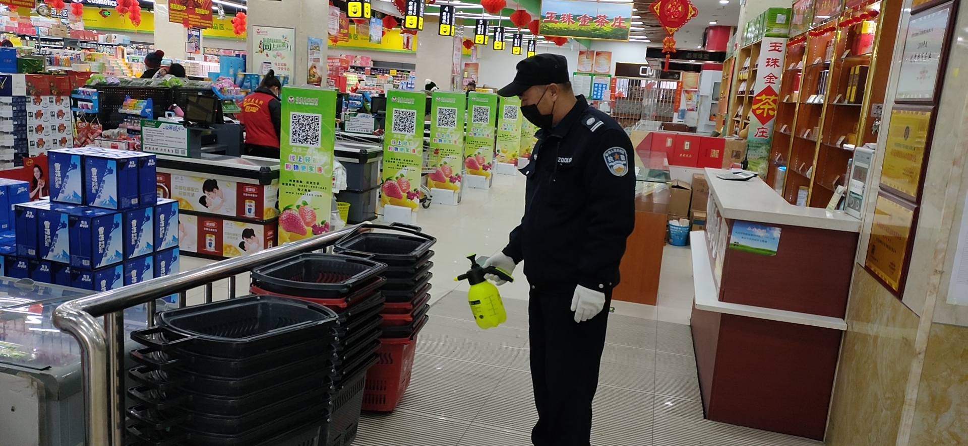为预防疫情传播,保障客户及员工的安全,特美易购各店进行全面消杀,对于人流密集的公共区域和卫生死角进行每日重点、多频次消杀。对每天值班的员工及来往的客户进行体温测量,并做好相应的登记。