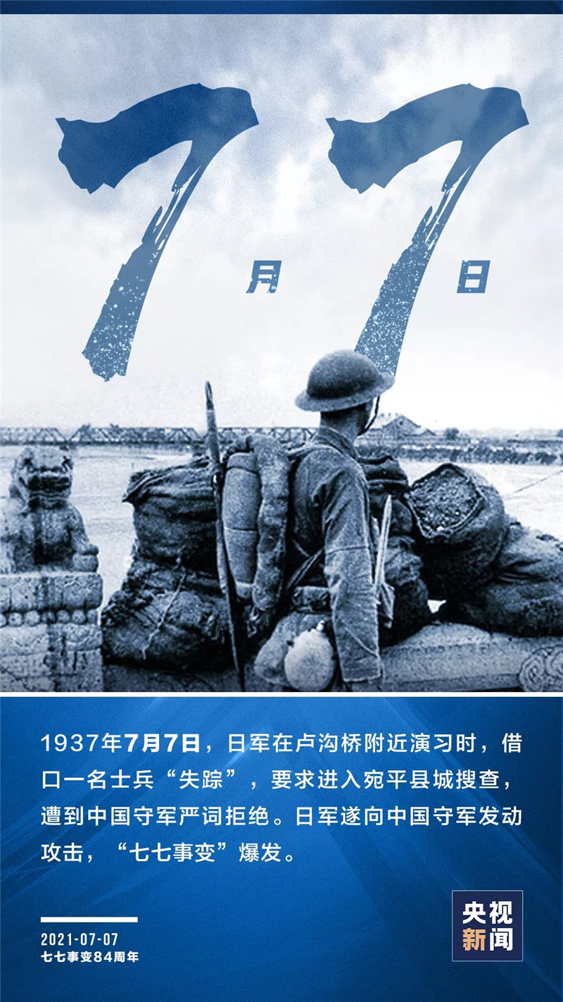 今天(7月7日)是七七事变爆发84周年。84年前,日本侵略者悍然发动全面侵华战争,无数中华儿女不顾生死,为保卫河山浴血奋战,奏响反抗侵略的英雄壮歌。 看下面一组图,致敬先辈不屈的抗争↓↓↓ 注:本文摘自“央视新闻”
