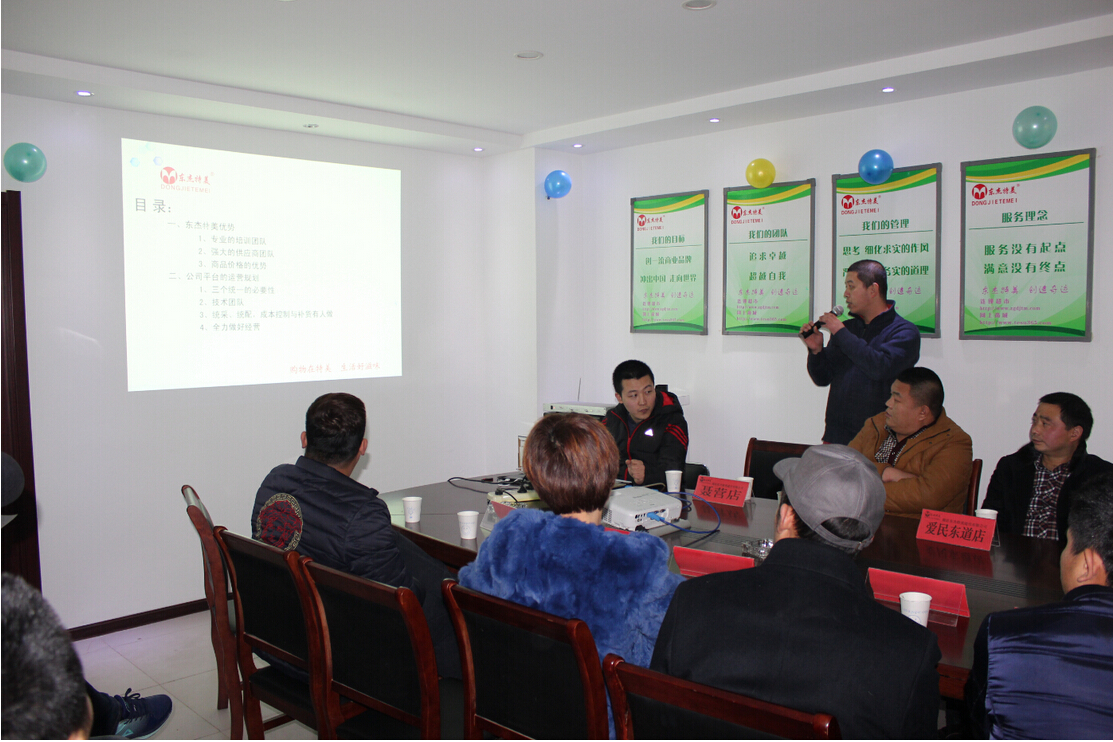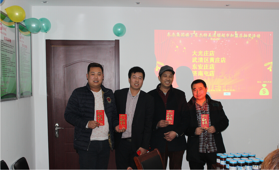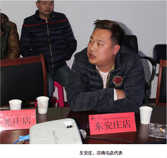 2015年1月10日,廊坊东杰特美超市有限公司加盟商年会在东杰特美大学城总部如期举行。参会人员30余人,主要包括:各店加盟商代表、供应商代表、公司主要管理人员。本次会议主题为:“决战2015”,主要内容为公司与加盟商、供应商之间在2014年的业务合作中存在的问题与经验进行多方面沟通、总结,争取在2015年的业务发展中扬长避短,互利共赢。