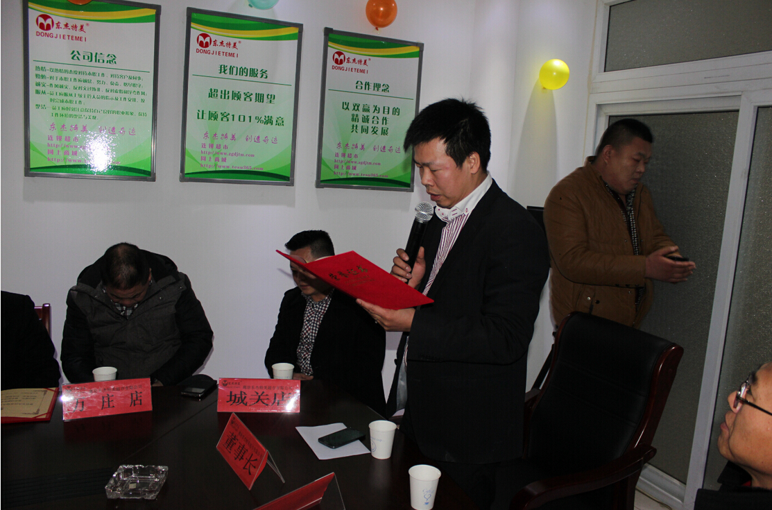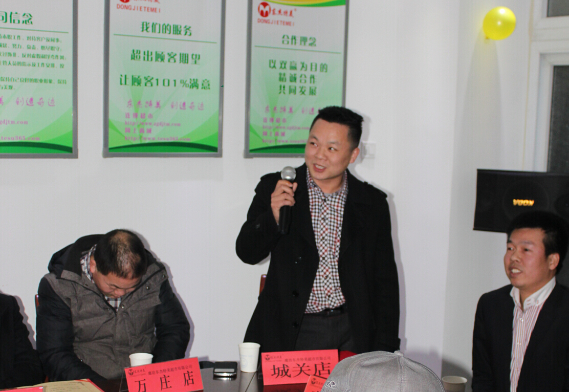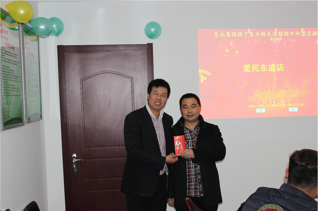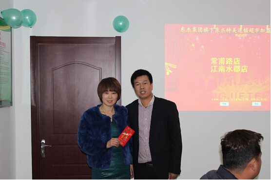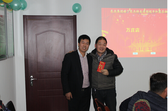 东杰特美超市爱民东道店荣获2014年优秀加盟店荣誉,由董事长徐伟东先生宣布并颁发荣誉证书及现金奖励。