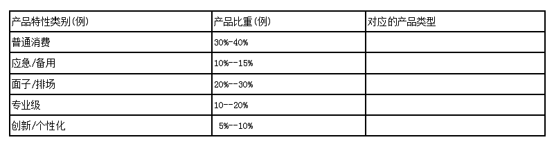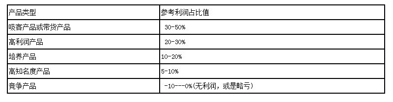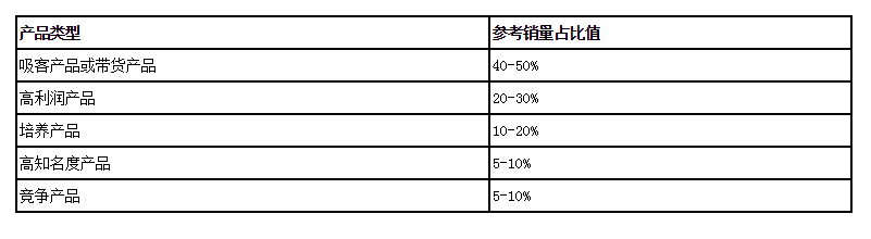 在结构确定之后,各类产品就涉及到一个比重的问题了,也就是什么样的产品,占比设定在多少比较合适,常规的产品比重如下,可供参考: