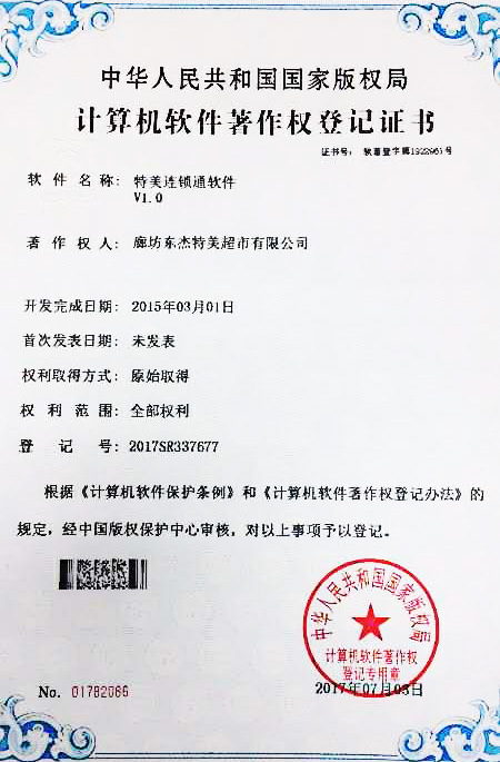目前国内软件著作权申请仍比较难,面对这种情况,东杰特美连锁超市董事长徐伟东说:“现在是互联网大数据的时代,谁拥有了数据谁就拥有了未来,它决定着企业的未来发展和生存问题,虽然现在很多企业可能并没有意识到互联网数据带来的诸多问题的隐患,但是随着时间的推移,人们将越来越多的意识 到互联网数据对企业的重要性。互联网软件开发,数据收集即将改变我们的生活方式,工作方式和思考方式。东杰特美深刻意识到软件开发,数据收集的重要性,徐总高瞻远瞩,自2013年就高薪聘请了一批优秀、精干的技术团队自主开发、研究了商品收银系统、订货平台等一系列配套软件。目前收银系统、商品订货平台、连锁通后台软件等一系列配套软件已经开发成功并投入到使用中,效果显着。与此同时,2017年东杰特美连锁超市还荣获了计算机软件著作权登记证书。