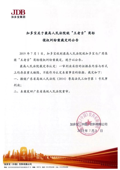 7月1日,加多宝收到最高人民法院就加多宝与广药集团“王老吉”商标侵权纠纷案裁定。