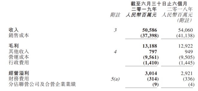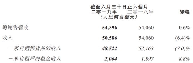 2019年上半年,高鑫零售销售货品所得收入为485.22亿元,较去年同期减少36.41亿元,减幅为7.0%。自2018年8月起,高鑫零售的家电部门便从自营转为由苏宁代销,此后,高鑫零售的家电产品销售收入为佣金收入,而非总销售营收。