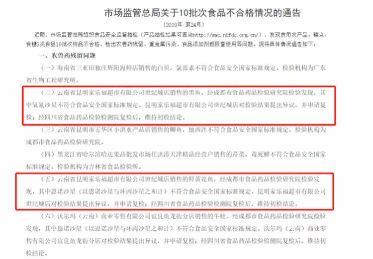 8月5日,市场监管总局发布关于10批次食品不合格情况的通告称,云南省昆明家超市有限公司乐福世纪城店销售的黑鱼,经成都市食品药品检验研究院检验发现,其中氧氟沙星不符合食品安全国家标准规定。昆明家乐福世纪城店对检验结果提出异议,并申请复检;经四川省食品药品检验检测院复检后,维持初检结论。