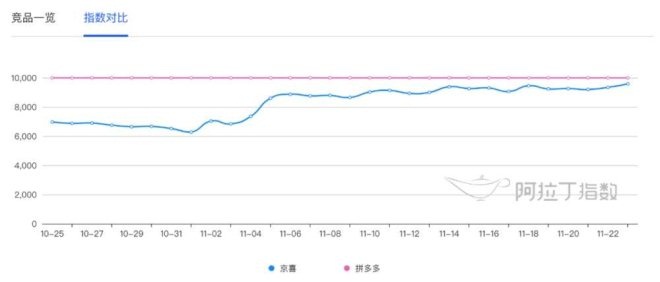 京喜小程序推出后,直赶拼多多。从小程序观察平台阿拉丁的数据来看,过去30天,“京喜”指数从11月6日开始上涨,目前指数为9584,接近拼多多的10000。(投中网注:阿拉丁指数是指,通过小程序人气、搜索、使用、分享等指标,计算出来的小程序综合评分。)