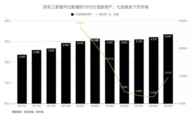 发力下沉市场的确为京东带来了新用户。在今年三季度财报中,京东第一次明确提到地提到,该季度七成新用户来自下沉市场。