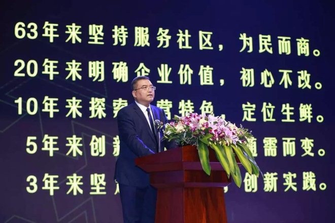 会上,超市发党委书记、董事长李燕川发表了《不负年华 不负时代》的主题致辞。其回望了超市发63年来的传承与创新,献礼改制20年来历尽艰辛、砥砺前行的不易,同时寄语未来,超市发将从高速度向高质量发展转向,扎根社区,做有温度的店铺。