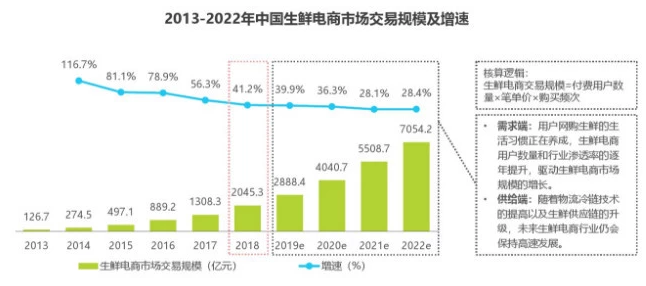根据艾瑞咨询发布的《2019年中国生鲜电商行业研究报告》,2019年生鲜市场交易规模预期有接近40%的行业增速,远高于全国零售行业仅20%出头的增速。预计到2022年,生鲜市场的总交易规模约为7000亿元人民币。