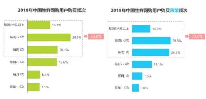 而根据艾瑞数据,2018年中国整体的生鲜网购用户中,63.8%的用户购买频次达到每周一次;但一旦将购买的品类限定到蔬菜,这一数据骤然上升至72%。
