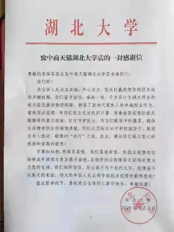 信中对中商超市工作人员在疫情时期坚守岗位,贴心服务表达了高度的赞赏,中商超市做的不仅仅是一个小超市的应该做的事,更多的是尽到了个大型企业的社会责任,在物资紧俏时,千方百计的组织消杀商品到校园,尽量满足校内所有师生家属的需求,在政府倡议少出门,不出门的时候,他们却逆行保供,还精心设计非常时期的售卖方式,极大限度的减少了人群聚焦,减少了购买时间,得到了广大师生及家属的认可。