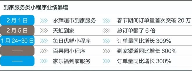 春节期间,各大商超、生鲜平台纷纷爆仓,运转处于极限状态。为了避免出入人多场合,很多人选择了在微信小程序下单购买一日三餐和日常生活用品,人们惊喜地发现,小程序上的配送到家服务已经做得如火如荼。