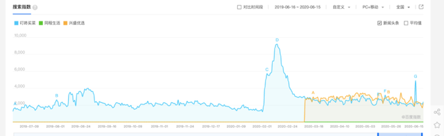 而在前置仓领域,最擅长造势的当属叮咚买菜。地处上海,再加上擅长与当地政府发展互联网经济强绑定,叮咚几乎每一次的融资新闻,都能成为财经媒体的焦点。百度指数上,在今年3月前,叮咚买菜的热度一直高于兴盛优选和同程生活。以巅峰时期的2月7日为例,叮咚买菜的搜索指数高达9199,而兴盛优选和同程却双双为0。