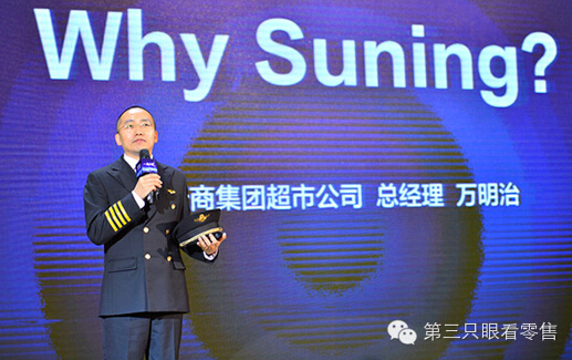 苏宁超市总经理万明治以一身“铁老大”的制服出场。他调侃称苏宁超市是一辆高速列车,他则是列车长。
