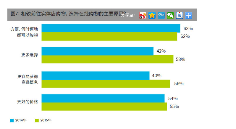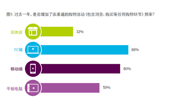 ·网络购物仍是大势所趋。在过去一年中,只有32%的中国消费者增加了在实体店的购物频率,与其相对的,88%的中国消费者增加了在PC端的网购行为,59%增加了在平板电脑端的购物。