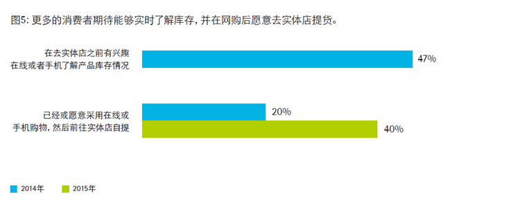 作为无缝体验的重要一环,零售商尤其需要建立实时和透明的库存管理体系,重新预估各个渠道的分配货物量,打通供应链的各个环节。在本年度的调查中我们发现,已经或愿意采用先在线购物再前往实体店提货的消费者比例较去年提升了整整一倍;同时,近一半的消费者在去实体店之前有兴趣在线或者用手机了解产品库存情况(见图5)。