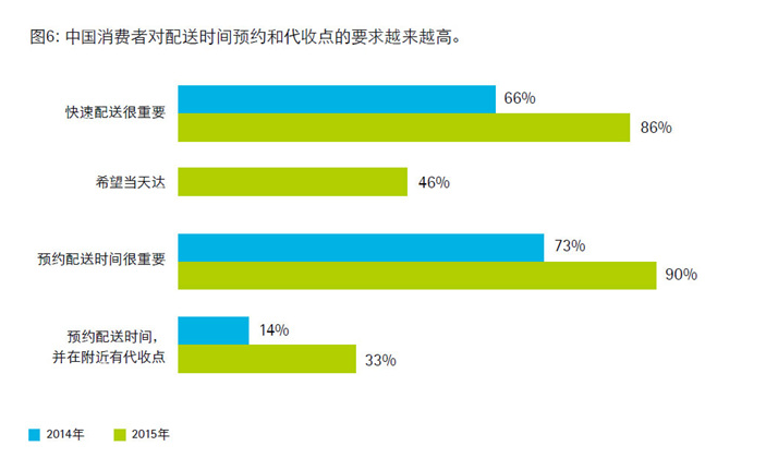 中国的消费者恐怕是全球最挑剔的消费者。近几年,物流和配送服务的飞速发展使中国消费者对配送时间预约和代收点的要求越来越高。调研中,近一半的受访消费者期待所购买的商品可以当天到达,90%希望可以预约配送时间,33%希望附近可以有代收点(见图6)。消费者对配送速度和配送灵活性的挑剔对传统零售商可能意味着更多的机会,这也是零售商需要极其重视并提升的购物体验之一。