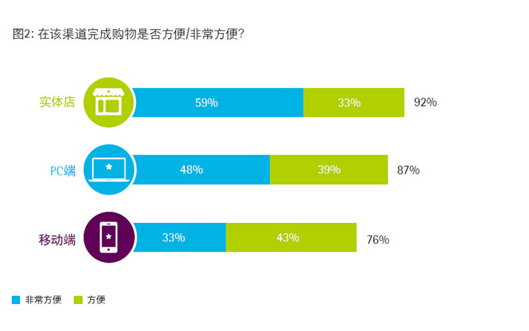 移动购物虽然发展很快,但端到端的体验并不令人满意。受限于网络环境、手机屏幕大小,移动端下单虽然方便,但商品信息的描述、促销信息的浏览仍不及PC端和实体店高效。在埃森哲的调研中,只有33%的消费者认为手机端购物非常方便。(见图2)