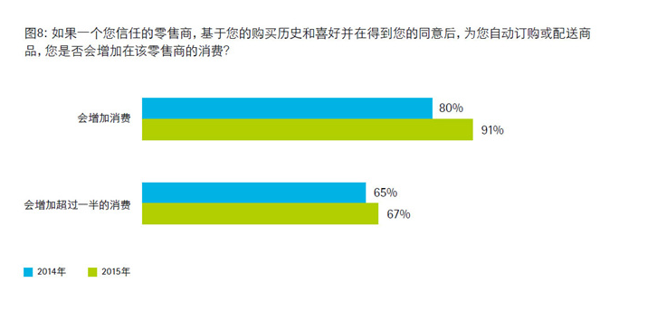 例如,中国的消费者喜欢“定期购”服务,如果熟悉的零售商可以提供定期购服务,超过90%的消费者会增加在该零售商购买日常用品(见图8)。因此,1号店已经率先 推出“定期购计划”,加入定期购计划的消费者不仅可以享受价格就低的原则——无论商品的市场价格如何变化,消费者均享受最低价格,而且可以获得极大的购物便利性,一次性设定所需商品、购买周期和订单时间,商家就会定期自动地提供送货上门服务。