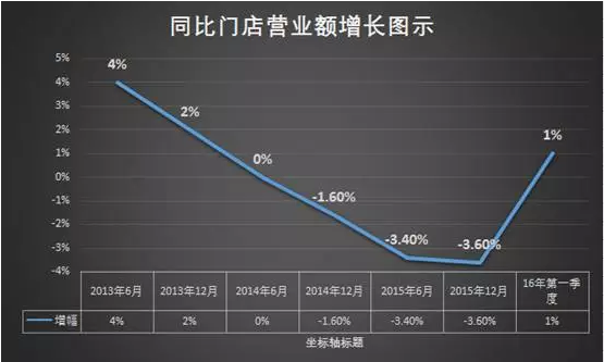 自上市以来伴随着电子商务的崛起和同业竞争的加剧,大量实体企业的销售份额在下降。根据高鑫零售的财务报告看,2015年同比门店销售下降3.6%,同样创造自上市以来的销售新低。尽管在今年一季度实现可比门店正增长, 2016年全年情况如何还有待观察。