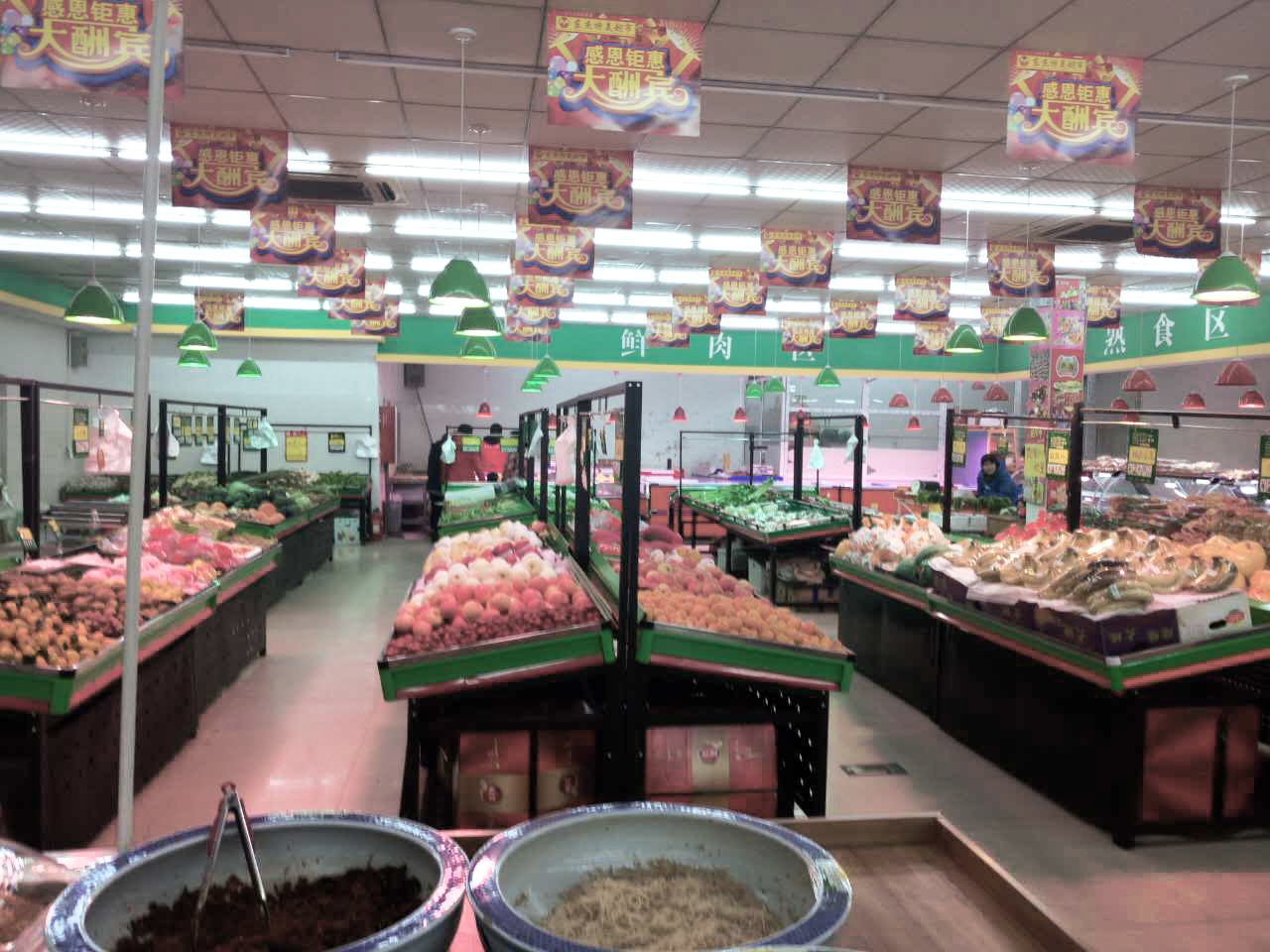 整齐干净的生鲜水果、鲜肉熟食区