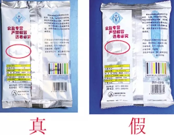 一看封口线是否为热切口,热切口为真。假食盐包装两端封口处相对平整,为锯齿状,属于冷切口;而真的食盐是自动热包装的,切口处有软化不平的痕迹。