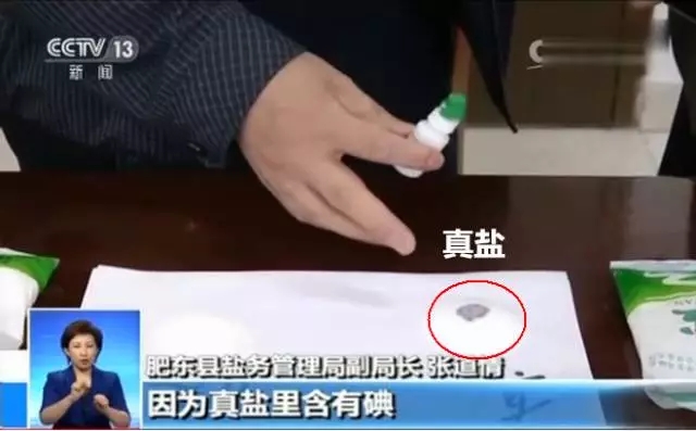 肥东县盐务管理局副局长还告诉了我们一个最直接的办法:用碘试剂进行检测,真盐里面会变成蓝色,而假盐里面是不变色的。因为真盐里面含碘,而假盐不含,所以假盐不变色。