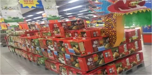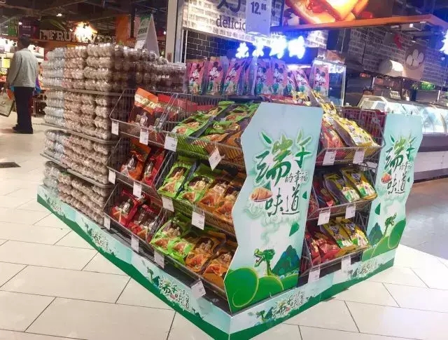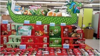 2、卖场整体的端午节日气氛浓厚,加上,整个粽子陈列以龙舟形式体现,寓意吉祥,吸引眼球的同时更能让人直接联想到端午;