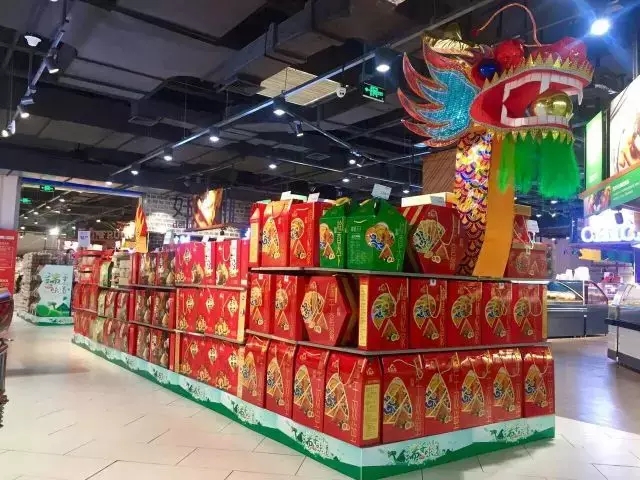 端午节是中华民族的传统节日,流传至今,渊源流长。不同的地方有不同的风俗习惯及文化,赛龙舟,跳花车等都是中华民族人民对节日的喜爱。而上图陈列礼盒包装均以红色为主,红色更易突出商品,更吸引顾客的眼球,礼盒装统一陈列在一起,更易方便顾客选购!结合龙头一推头形式连城一体,仿佛在卖场里搭建了一艘生动形象而喜庆洋洋的大龙舟,更突显了中华民族的喜庆热闹氛围。