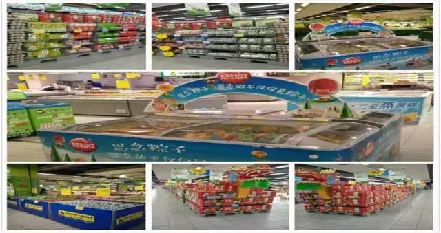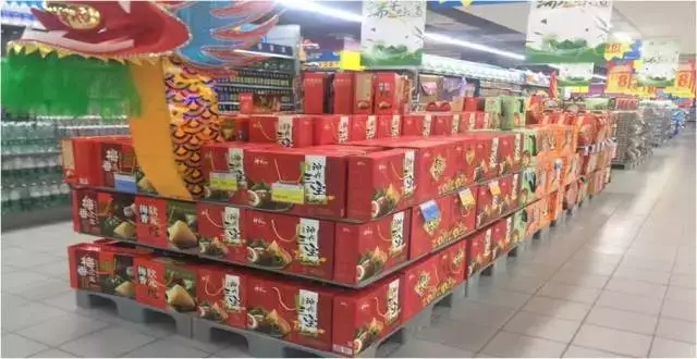 上图把礼盒装粽子陈列在超市入口处,能够让顾客一进来就可以感受到端午浓烈的氛围。高端礼盒装粽子系列陈列在这样的位置上量走的比较大,对端午期间销售有很大的提升。