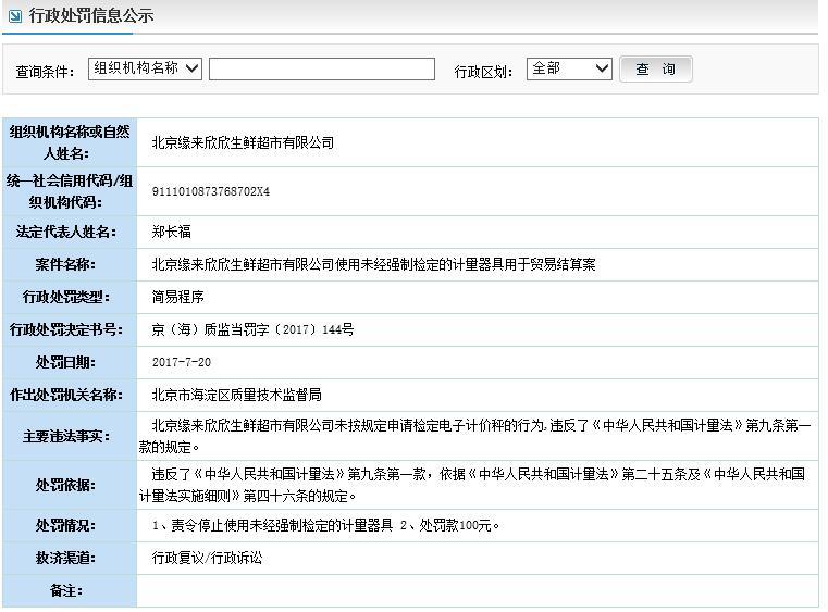 北京缘来欣欣生鲜超市违反计量法被处罚