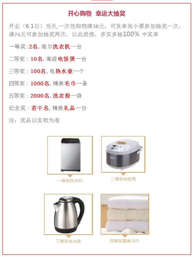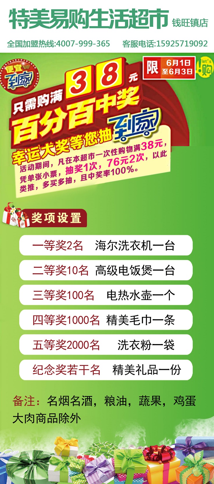6月1日-3日活动期间,凡在本超市一次性购物满38元,凭单张小票,抽奖1次,76元2次,以此类推,多买多抽,且中奖率100%。