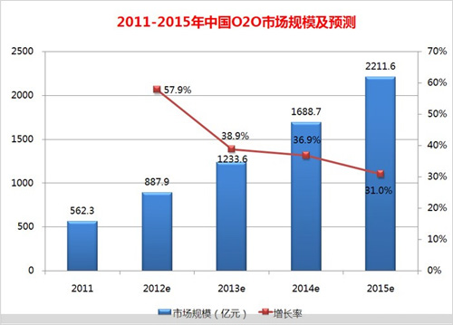 据研究数据显示,2011年中国O2O市场规模为562.3亿元,未来几年将持续增长,预计2015年将达到2211.6亿元。