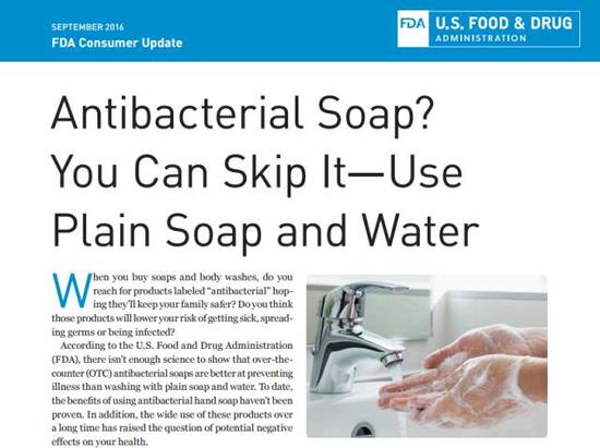 ▲FDA网站截图,图片大意为《抗菌香皂?你可以无视它们,用普通的香皂和普通的水就可以了》
