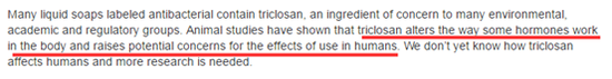 ▲FDA网站上述截图标红文字称:动物实验表明,三氯生改变了人体内激素(也就是“荷尔蒙”)的工作方式,同时增加了对人类潜在健康问题的影响。