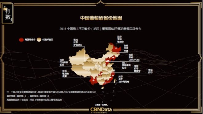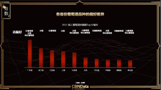 中国土地幅员辽阔,不同地区对葡萄酒的偏好也不同。相对来说,东部沿海省份对葡萄酒有高偏好,西部地区对葡萄酒的偏好较低。在偏好较高的省份中,销售额排名前三的品牌也各不相同。不同省份对葡萄酒品种的偏好也不同,