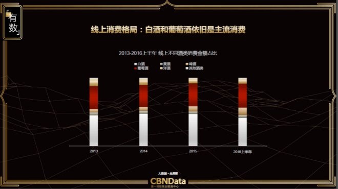 《报告》显示,线上酒水销售主要分为白酒、葡萄酒、啤酒、黄酒、洋酒。其中,葡萄酒和白酒占到了绝大多数的比重。啤酒现阶段消费金额比例虽小,但涨幅明显。