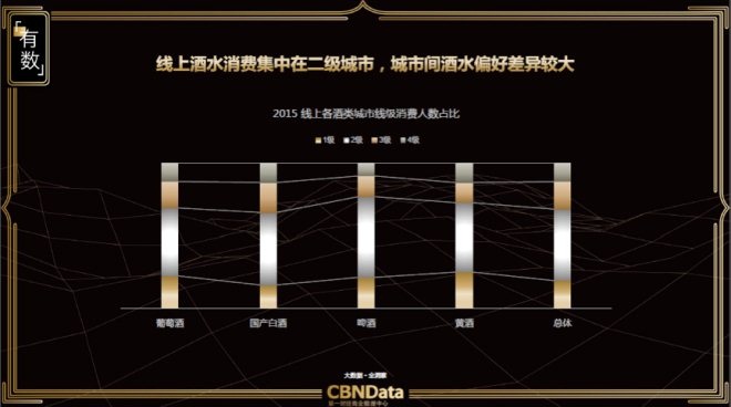 目前线上酒水消费集中在数量较多且经济发达的二线城市,远超其他线级的城市。