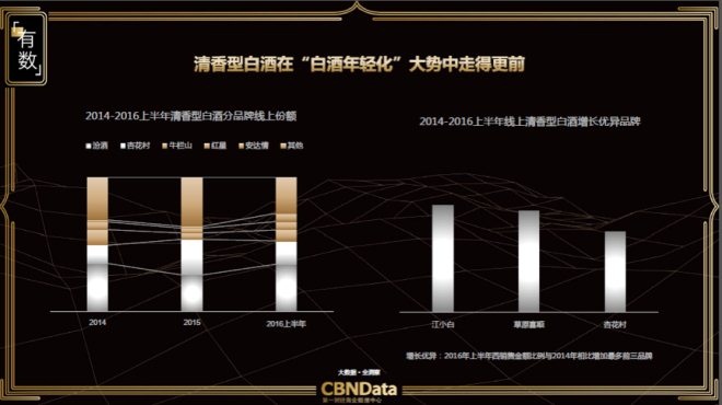而在年轻男性购买的TOP10白酒品牌中,众多清香型白酒品牌进入榜单。清香型白酒的线上市场份额逐年上升。清香型白酒中增长最快的品牌是江小白。白酒行业是很典型的品牌导向型行业。新兴崛起的江小白,瞄准年轻消费者市场,利用影视剧植入、互联网传播等手段,在年轻人中提高知名度。