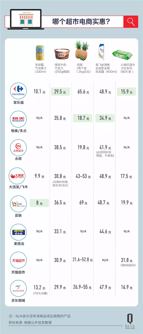 值得指出的是,除了麦德龙和物美承诺“线上线下统一价格”之外,其他几家的门店和电商都不能保证一致的价格。