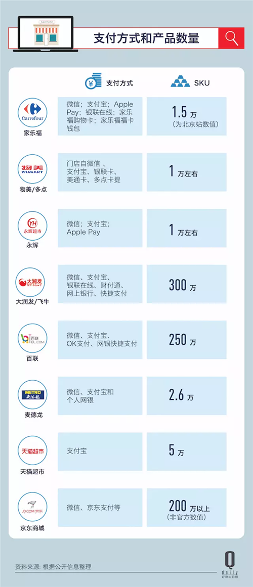 百联电商和飞牛网更像京东商城或亚马逊那样的线上超市+百货,SKU(据说)是百万级别的。家乐福、麦德龙、永辉和物美/多点则更接近传统意义上的大卖场超市,以食品和日化用品为主,SKU在1~2万。