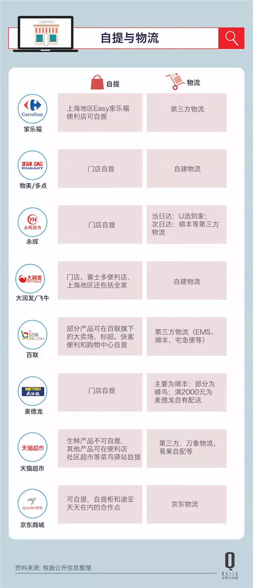 除了多点(物美)和飞牛网(大润发)用自有物流配送之外,其他的超市电商都是外包给第三方快递公司。