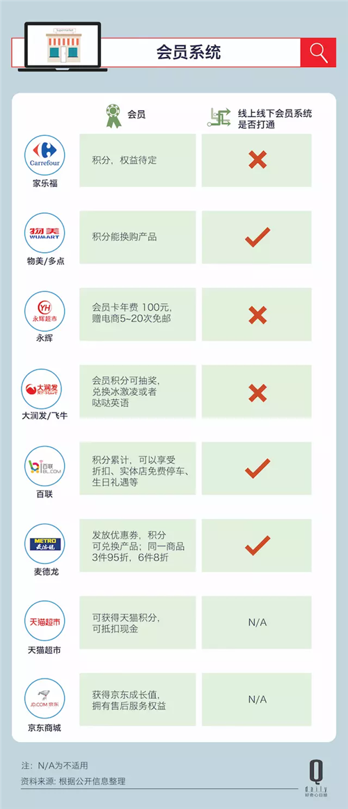 另外永辉、家乐福以及飞牛网(网上大润发)的线上线下会员体系都没有打通。如果是打算做客群来留住消费者,打通会员体系还是比较重要的。