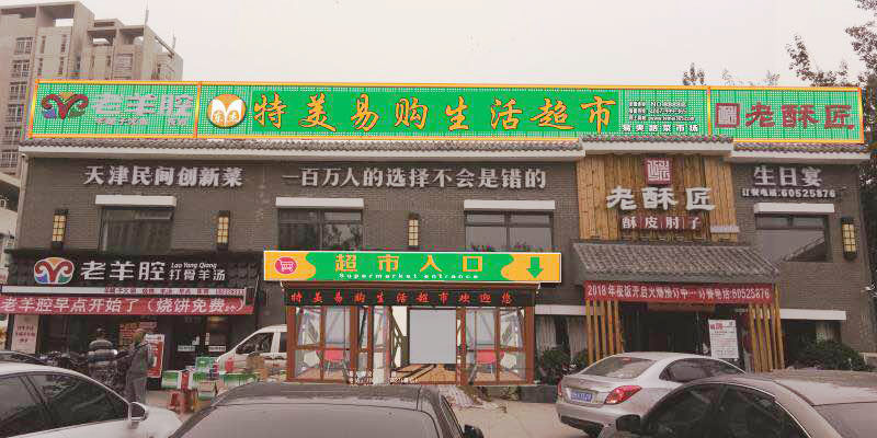 天津市河北区特美易购生活超市是特美易购(原名东杰特美)首家特美易购超市。占地1500平方米。经营黄金珠宝、大众服装、箱包皮具、散称食品、烟酒茶叶美食小吃、手机数码、手表眼镜、面包糕点、鲜肉果蔬等等。特美易购生活超市,目前正在紧锣密鼓的筹备当中,超市门头效果图已经出来了,现在抢先目睹特美易购生活超市门头效果图吧。