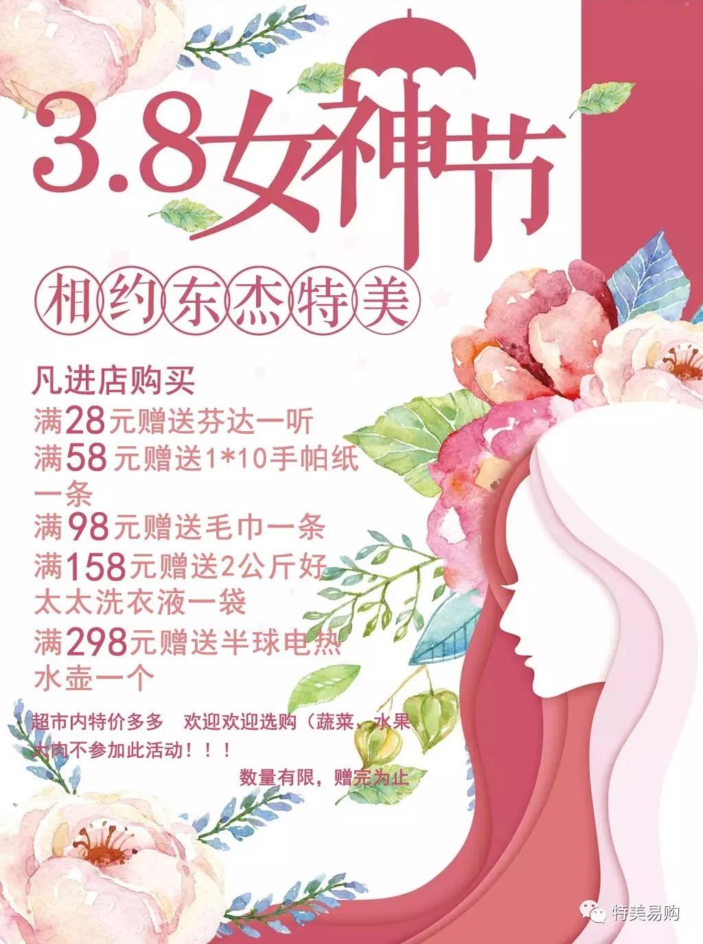 又到了女性朋友们欢庆节日的日子了,东杰特美超市携全体员工祝所有的女神们(不分年龄)节日快乐,青春永驻,幸福满满,这里也没什么更好的礼物送大家,唯有智慧便利送给大家!