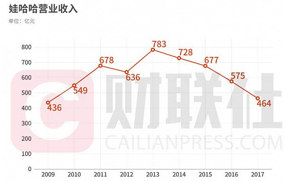2010年,娃哈哈的营收首次突破500亿元,宗庆后还发出豪言,要达到1000亿元的目标。不过就在第二年,娃哈哈的业绩出现了首次下滑。虽然在2013年创造出了783亿元营收的佳绩,但是之后业绩就开始一路下滑,到了2017年营收跌到了464亿元,距离1000亿元的目标已经相去甚远。