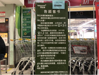 12月2日中午,记者赶赴华润万家陇海中路鑫苑店,该店地处陇海中路与庆丰街交叉口鑫苑美适广场负一楼。在超市入口,记者看到该店挂出的告顾客书。其中提及,“因区域经营调整,公司决定郑州陇海中路点将于2019年12月3日停止对外营业”。同时,该店原有顾客持有的购物卡、会员卡,仍可在河南地区范围内的所有华润万家门店继续使用。