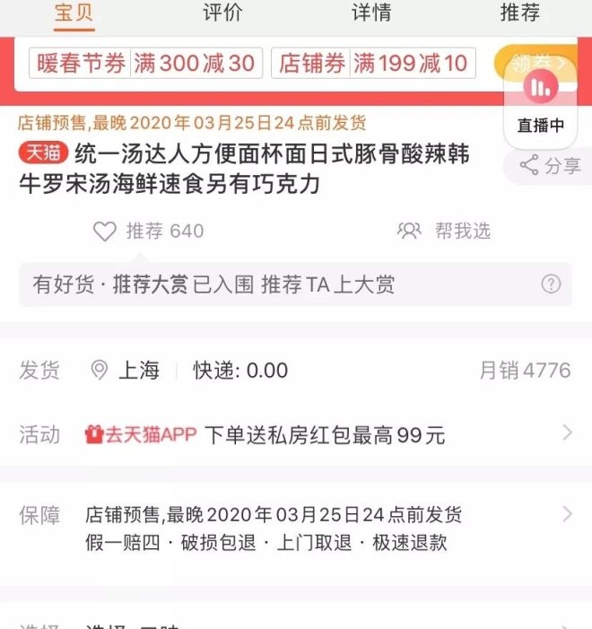 「电商在线」查询统一的天猫官方旗舰店发现,目前现货很少,大部分产品仍是预售状态,最晚3月25日才能发货。