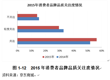 通过对2015年消费主体行为的数据研究,报告发现,以追求低价著称的网络消费特征也在发生改变。消费者开始愿意为高品质、知名品牌买单,追求品牌品质消费的群体快速扩大,逐渐成为网络消费的主力军。京东大数据显示,2015年对品牌品质表示“关注”的消费者占网购消费者的比重高达56.40%。而对品牌品质“轻度关注”的消费者比重为29.58%,“不关注”品牌品质的消费者比重仅为14.03%,均比2014年有所下降。